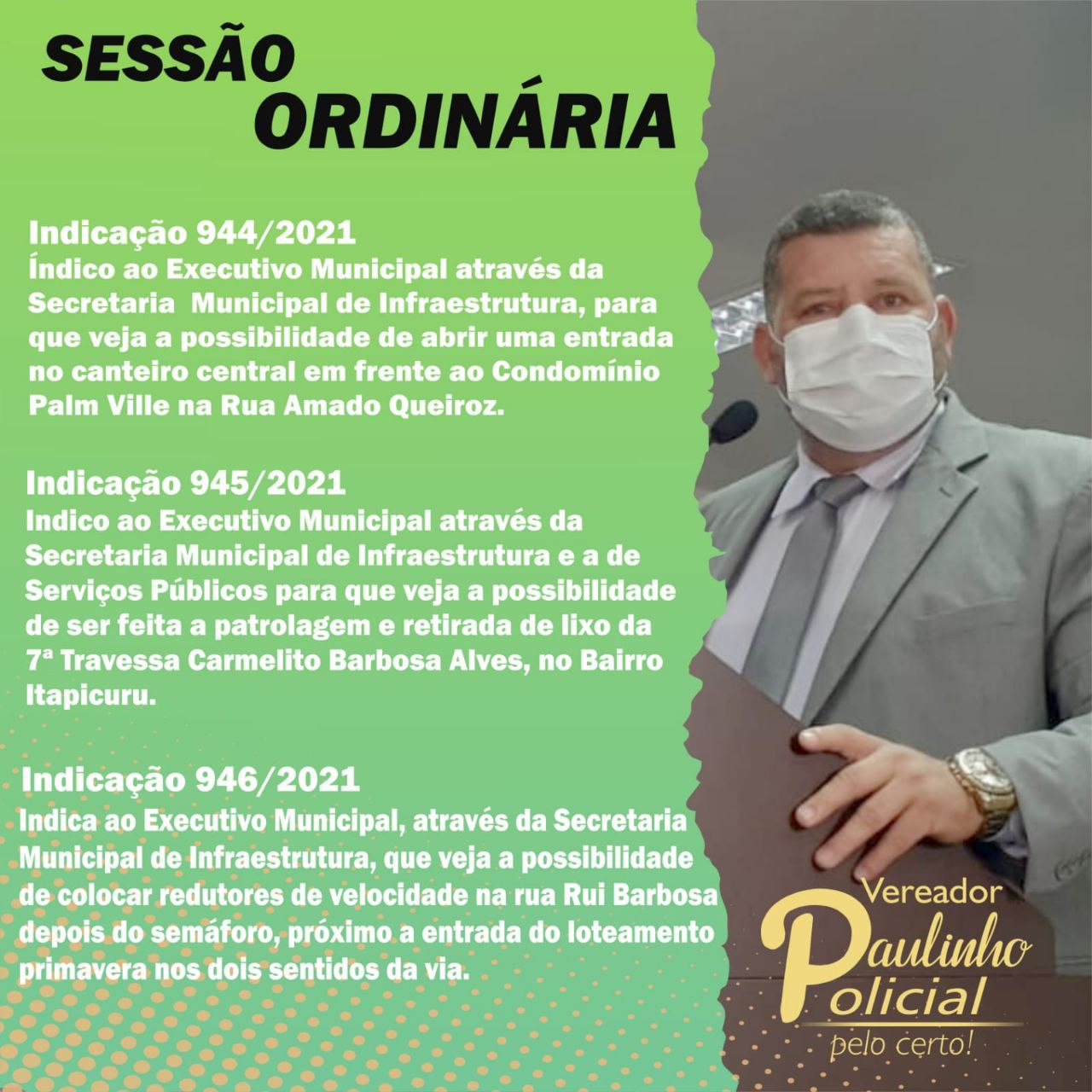 O vereador da Câmara Municipal de Cruz das Almas, Paulinho Policial (PSD), usou do grande expediente na 16ª Sessão Ordinária do 2° Período Legislativo, realizada na noite desta segunda-feira, 18, para apresentar suas indicações ao Executivo Municipal.